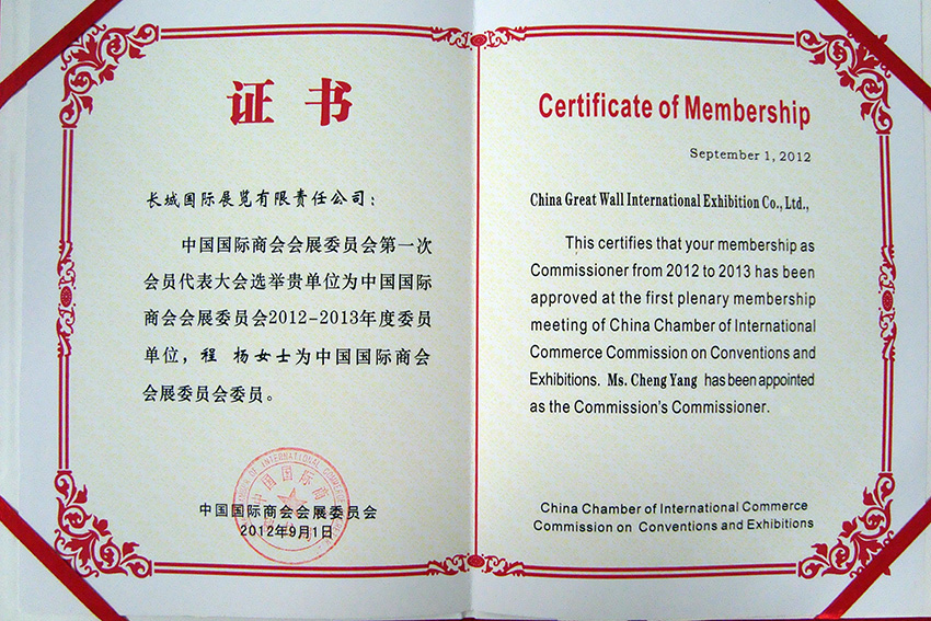 長城國際展覽有限責任公司被中國國際商會會展委員會第一次會員代表大會選舉為2012-2013年度委員單位,程楊總經理為中國國際商會會展委員會委員。
